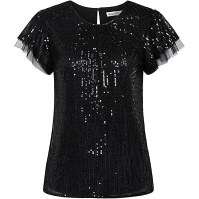 Women's Sparkly Sequin Tops Short Sleeve Glitter Dressy Blouses Round Neck Club Ruffle Party Tops