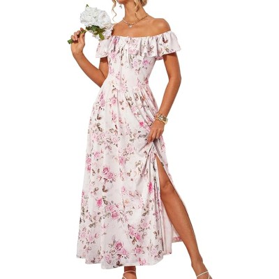 2025 Womens Maxi Dresses Summer Off Shoulder Floral Dress Ruffle Split Beach Flowy Boho Wedding Guest Dress