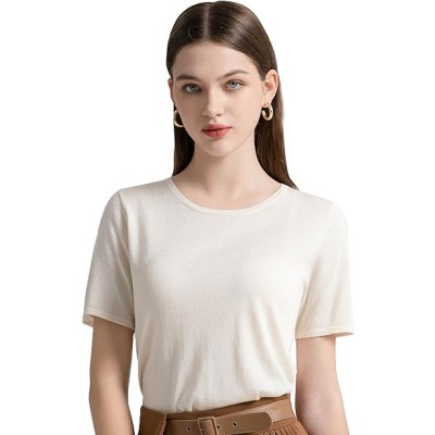 Women's Silk Cashmere Round Neck T-Shirt Stretchy Basic Tee Summer Tops for Women