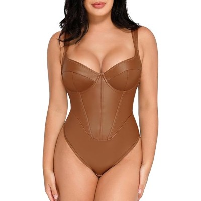 Leather Corset Bodysuit for Women Tummy Control V Neck Thong Shapewear Sleeveless Body Suit Trendy Tops
