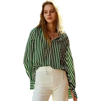 Silk Blouse for Women 100% Pure Silk Shirt Long Sleeve Luxury Smooth V-Neck Tops Womens Spring Striped Shirts