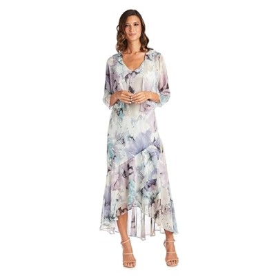 Elegant High Low Ruffle Floral Print Chiffon Dress W/ 3/4 Sleeve Sheer Coordinating Bolero