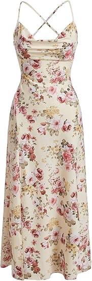 Women's Elegant Floral Printed Draped Collar Criss Cross Backless Midi Dress