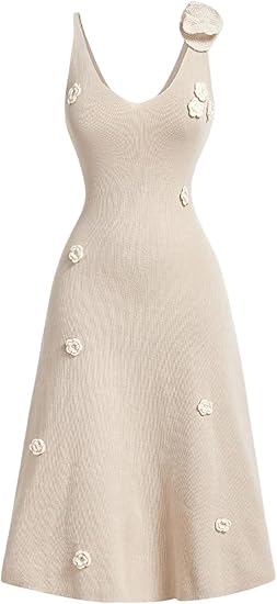 Women's 3D Flower Backless Sweater Dress Sleeveless Slim Fit Flared Hem Midi Dresses