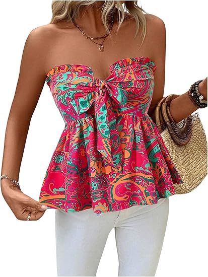 Women's Casual Strapless Bandeau Graphic Print Bow Front Corp Tube Top