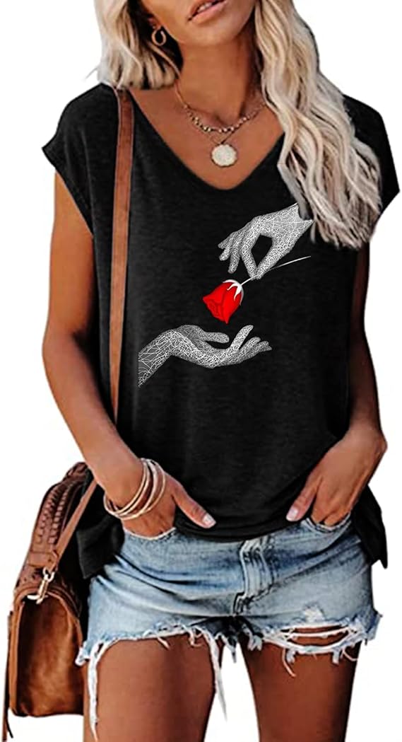 Women's Cap Sleeve Tank Tops V Neck Solid Print Casual Short Sleeve Loose Basic Shirt(BNWH S)