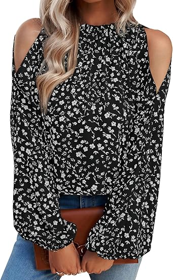 Women's Cold Shoulder Bishop Sleeve Floral Print Blouse Shirt Top