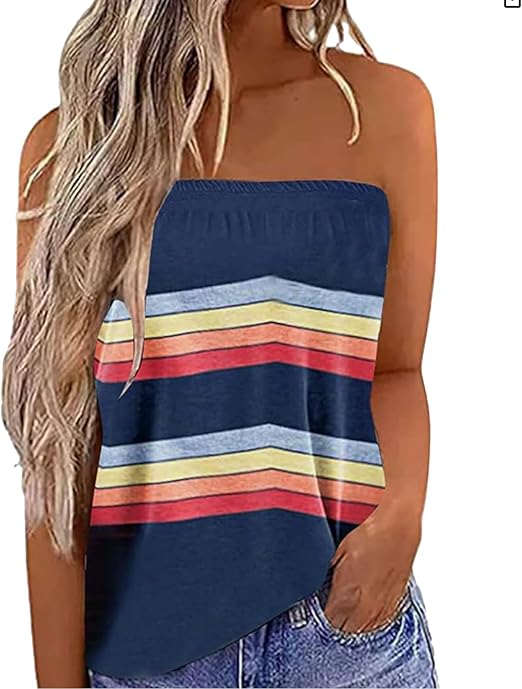 Womens Striped Tube Tops Strapless Bandeau Tanks Tops Backless Sleeveless Loose Fit Shirts Casual Blouse