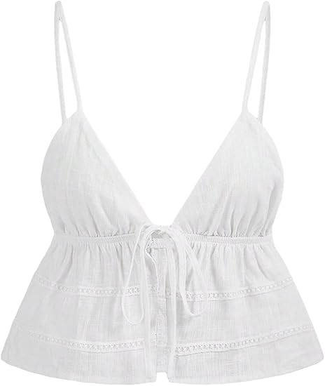 Women's Spaghetti Strap Deep V Neck Cami Crop Tops Tie Front Cami Sleeveless Peplum Top