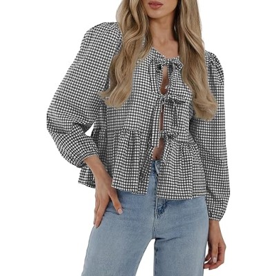 Women's Spring Fall Babydoll Peplum Blouse Shirt Puff Long Sleeve Bow Tie Front Trendy Cute Y2K Going Out Tops