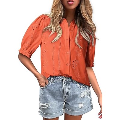 Women's Summer Tops Dressy Casual V Neck Short Sleeve Button Up Hollow Out Eyelet Lace Embroidered Blouses Shirts