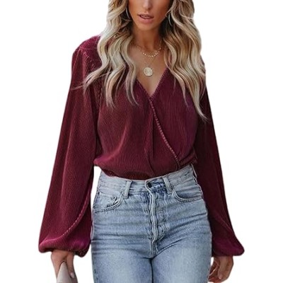 Women Long Lantern Sleeve Shirts Tops Dressy Casual Loose Fit V Neck Blouses
