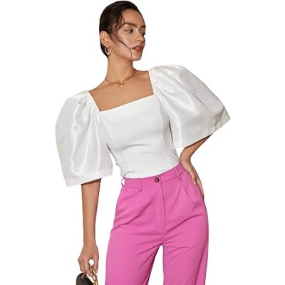 Women's Square Neck Puff Short Sleeve Elegant Blouse Crop Top