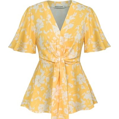 2024 Women's Elegant V Neck Floral Peplum Tops Tie Front Short Bell Sleeve Shirts Tops Blouse