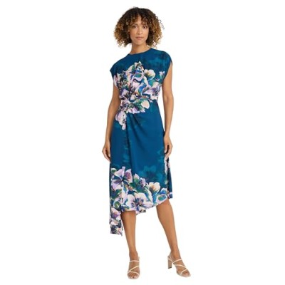 Midi Sleeveless with Ruched Waist, Asymmetric Ruffle Hem, Floral Dress for Women