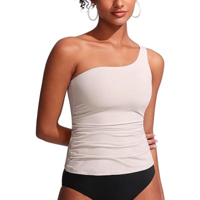 One Shoulder Tankini Tops for Women Ruched Bathing Suits Tummy Control Adjustable Swimsuit Only No Bottom Padded